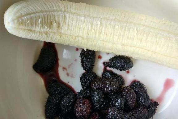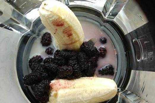 1.将桑葚用冷水浸泡一会儿,再冲洗干净,撸掉茎,沥净水份。再把香蕉剥皮备用。