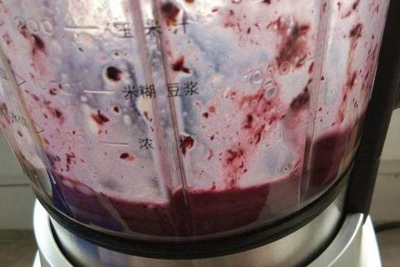 2.将香蕉、桑葚和杏仁露倒入料理机中,选择奶昔程序,搅拌十几秒。也可以直接用搅拌程序,拌匀即可。有颗粒也没关系。