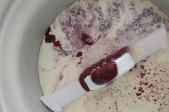 4.将淡奶油,细砂糖和桑葚香蕉奶昔混合,倒入提前冷冻了一天的冰淇淋桶内,再放几粒完整的桑葚进去,把冰淇淋桶装入面包机中,开始搅拌。我用的是面包机配套的冰淇淋桶,如果连这种也没有,还有另一种方法,稍后再分别说明。
