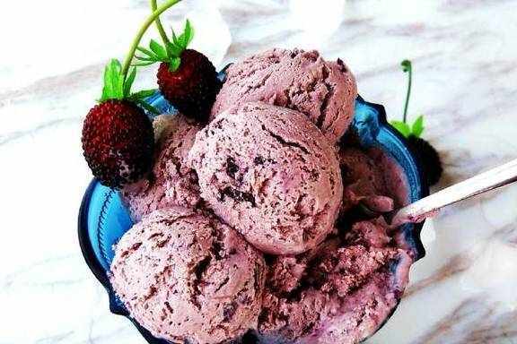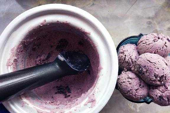 5.搅拌完成后,用冰淇淋勺把它挖出了就可以了。可以直接挖出吃掉,或者装入密封保鲜盒冷冻。挖球是个技术活儿,想挖得又圆又美观,不能挖一下就完美,得用挖球器反复挖,边挖边压几次,球形才会实。
