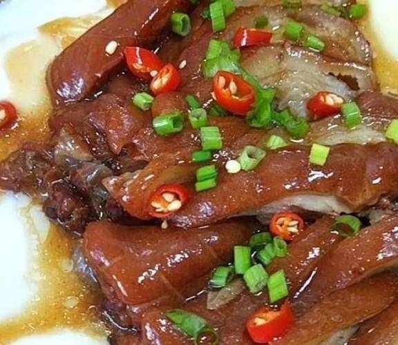蒸熟之后撒上红辣椒圈,葱花,再浇上煮肘子的汤汁。