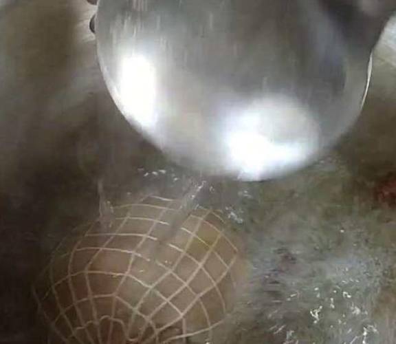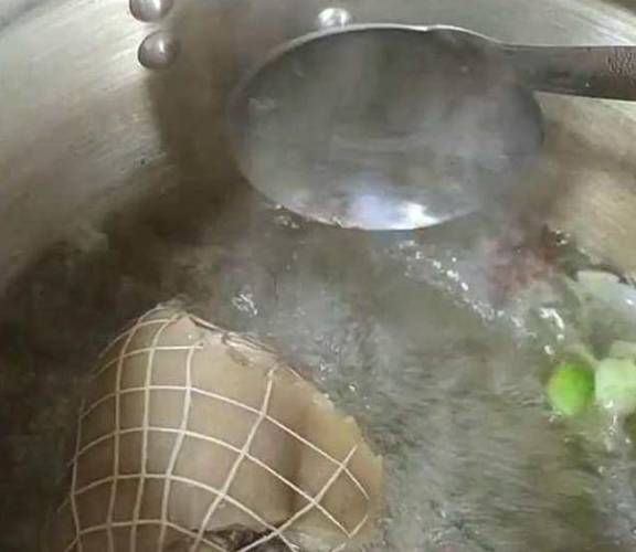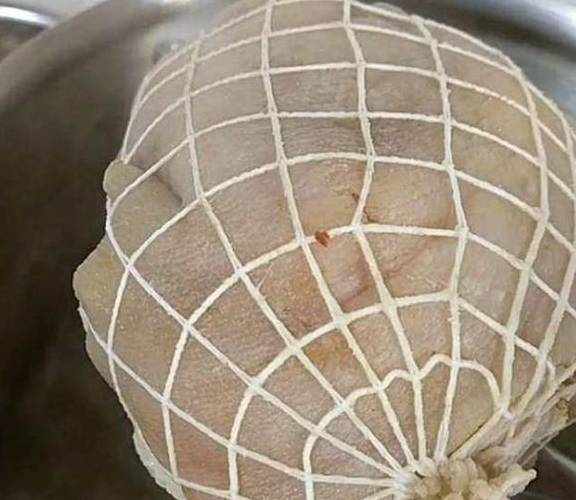 准备一个猪肘子,把这个给洗干净,然后沸一次水,再把猪肘子用这线捆起来,这个东西有卖的。