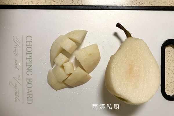 5、此時把雪梨削去表皮後切成小丁備用。
