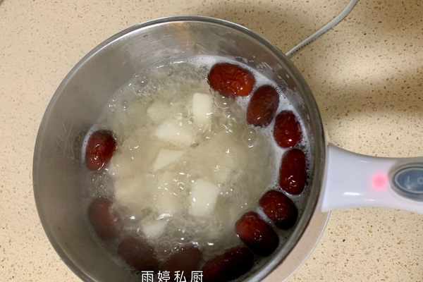 4、日常也可以用電鍋來燉銀耳雪梨羹,只需按動煲湯鍵先燉煮銀耳,之後加入紅棗,最後加入雪梨塊的順序即可,很是方便快捷。