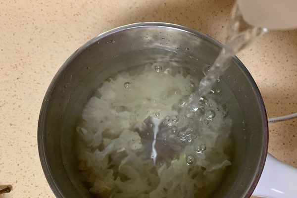 2、把泡發的銀耳放入燉鍋中,加入大碗水小火燉煮40分鐘左右。