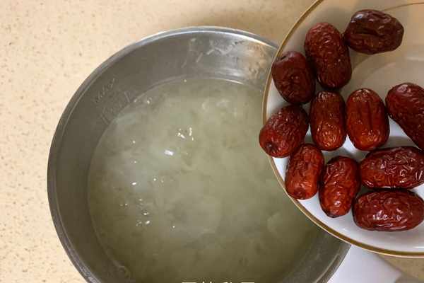 1、幹銀耳清洗後放入沒過食材的凉水浸泡10分左右即可泡發,紅棗和梨洗淨瀝幹備用。