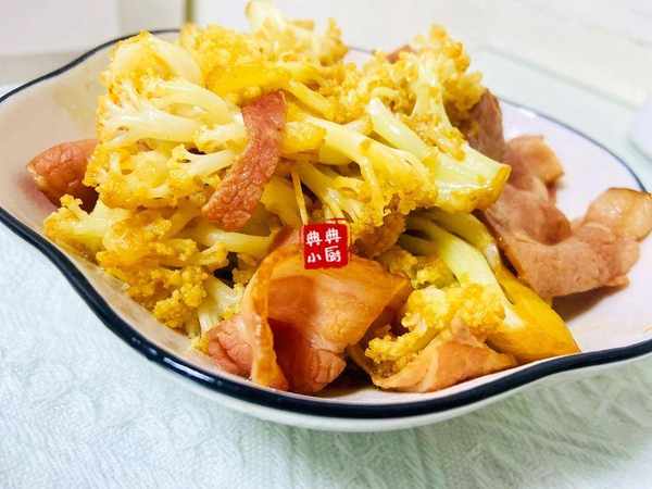 花菜炒好之后把之前煎好的培根倒进去,简单混合一下,再加适量盐提味就可以出锅了。