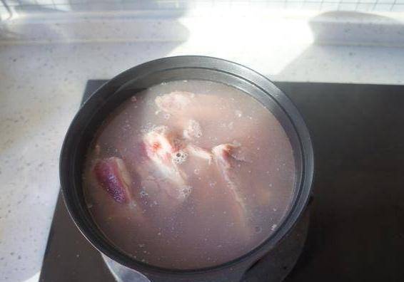 给锅中倒入适量的水,将排骨放入,待水面出现浮沫后,把排骨捞出,用温水清洗干净,沥干水分备用。