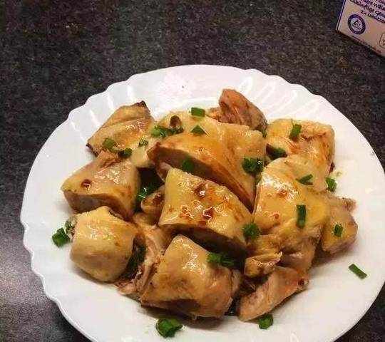 5.鸡肉焖好后,捞出放进冰水里过凉;过凉后的鸡肉切宽条,码盘;将做好的调味料和葱碎一起淋在鸡肉上,搅拌均匀;
