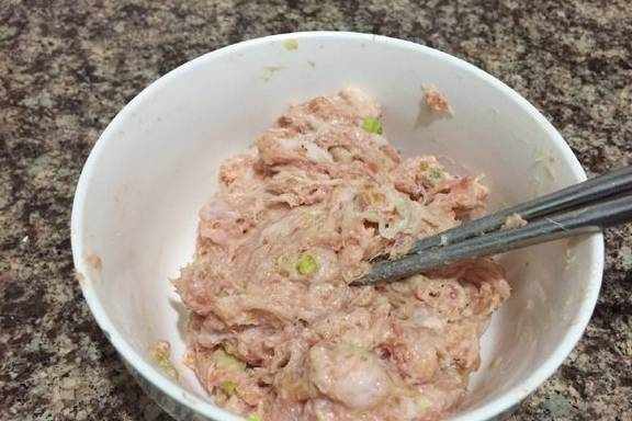 2、猪肉用搅拌机搅拌成肉末,肉末中加入葱、料酒、生抽、生粉、盐。
