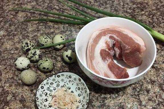 鹌鹑蛋、肉末、料酒、生抽、生粉、葱、盐。