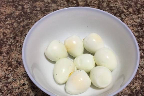 4、将鹌鹑蛋冲洗干净,冷水入锅,小火煮开后再煮3-4分钟,捞出浸泡在冷水中,剥去外壳。