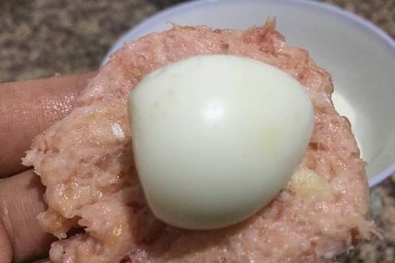 5、取适量肉馅按扁,放上一个鹌鹑蛋包起。