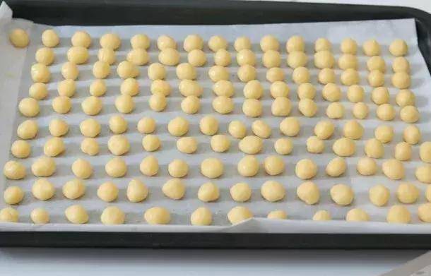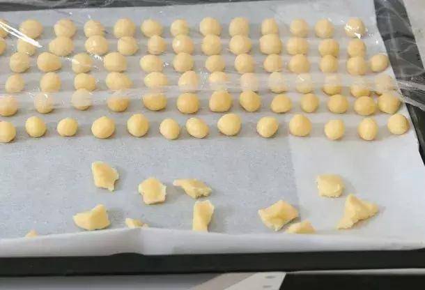 4.把面团颗粒搓成球放在烤盘上,然后盖上保鲜膜避免风干。