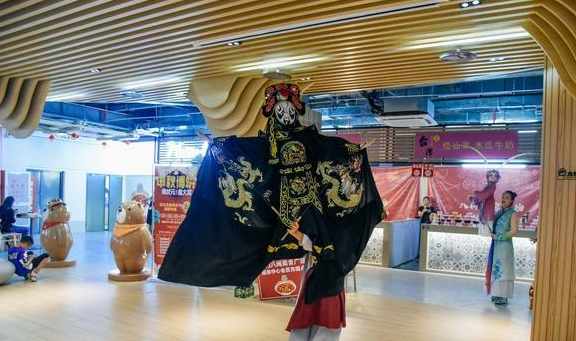 美食廣場是在底下負一層,坐手扶梯下來後,是一派熱鬧的場景,真有點當年定安夜市的風範。7000平的大空間,整齊地擺放著幾十個攤位。扶梯下來正對的是舞臺區,還有非遺木偶戲表演,吸引了附近的居民和遊客圍觀。