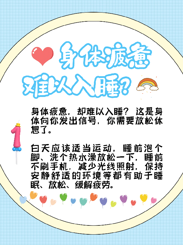 羊大师建议白天适当运动,睡前泡个脚、洗个温水澡放松一下,睡前不刷手机,减少光线照射,保持安静舒适的环境等都有助于睡眠、放松、缓解疲劳。