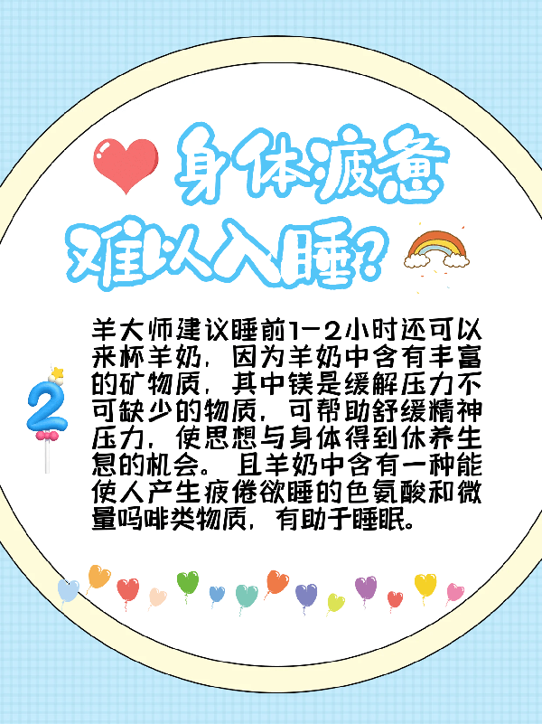 羊大师建议睡前1-2小时还可以来杯羊奶,因为羊奶中含有丰富的矿物质,其中镁是缓解压力不可缺少的物质,可帮助舒缓精神压力,使身心得到休养生息的机会。 且羊奶中含有一种能使人产生疲倦欲睡的色氨酸和微量吗啡类物质,有助于睡眠。