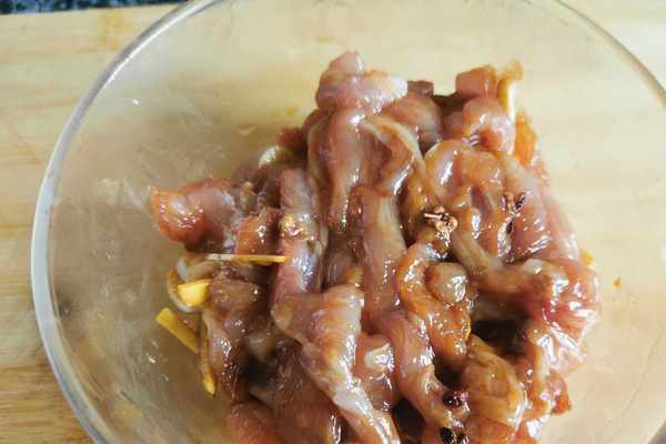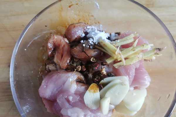3.猪肉切好加蒜、生薑、澱粉、花椒、醬油醃制。