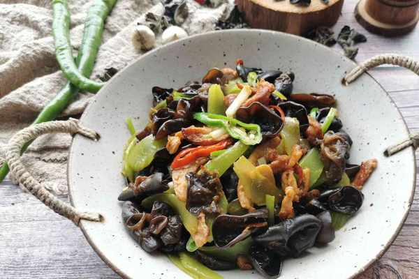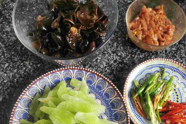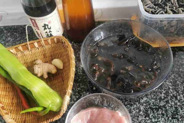 木耳(水發)20克、萵筍140克、猪肉(瘦)100克、青辣椒1個、酸辣椒1個、薑兩片、花椒粒少量、蒜1個、精鹽適量、食用油適量、豆瓣醬1勺、澱粉1克、小葱1根、醬油少量