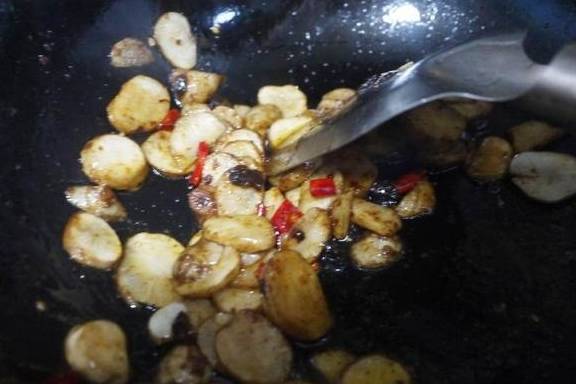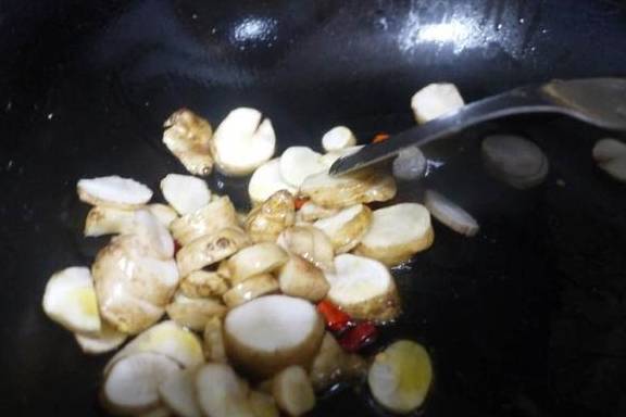 起锅入油爆干红椒,再倒入洋姜进行翻炒;