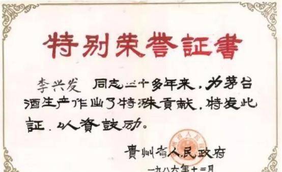 随后,李兴发不仅被业界称之为酱香之父,当地部门还为他颁发了特别荣誉证书。