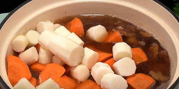 时间到了之后打开盖子,放入山药跟 胡萝卜,水太少了就加点开水进去,继续加盖子炖煮20分即可。