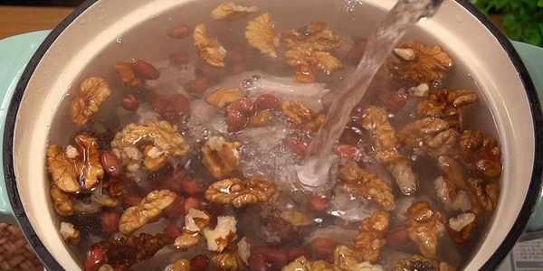接着准备一把花生米跟核桃,加点清水淘洗干净。这两种食材营养价值非常丰富,富含优质脂肪,还是丰富的食物纤维,对我们的肠胃蠕动很有帮助,做汤加点它不仅香营养还高。淘洗干净放在一边备用。