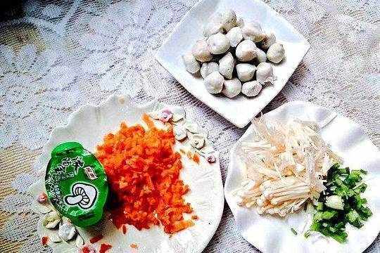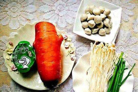 胡萝卜半个、金针菇60克、肉丸50克、葱少许、精盐2克、花生油5克、浓汤宝半块