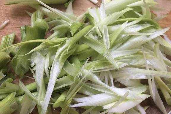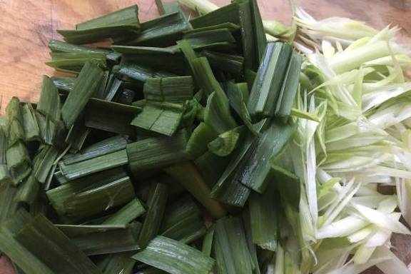 6.蒜叶和蒜白分开切成小段。