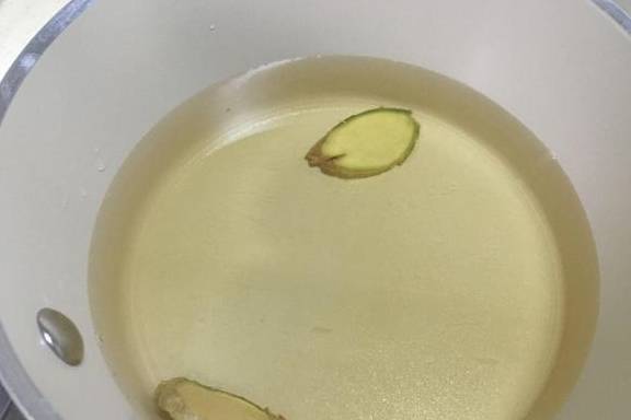 3.锅中加入二碗水,放入二汤匙料酒、三克盐、二片生姜和半汤匙白醋。