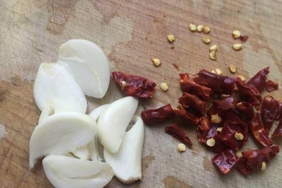 5.大蒜切成片,干辣椒切成小段备用。