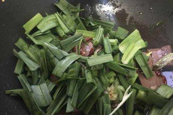 10.放入大蒜叶,大火断生即可关火,靠锅的余温翻炒均匀。