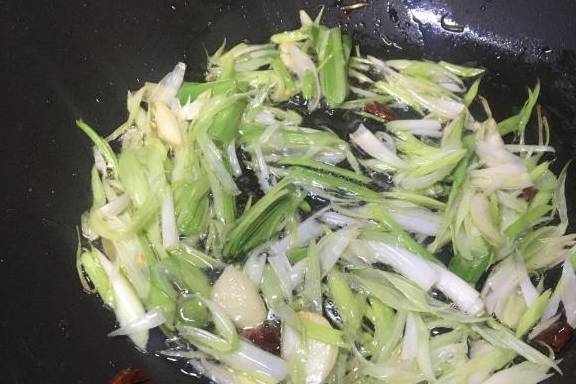 8.将蒜白先放入锅中,大火翻炒变软。