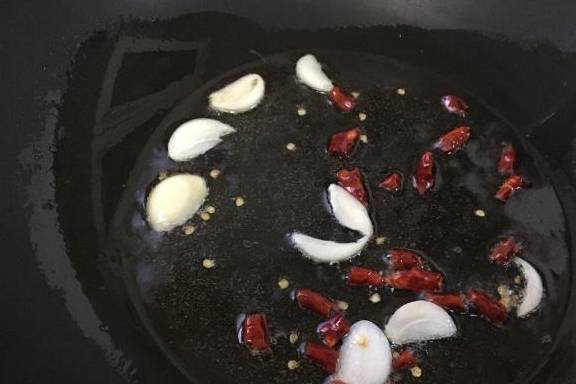 7.热锅热油放入大蒜片和干辣椒,中火慢慢翻炒出香味,火不易大,蒜片和干辣椒会有焦味。