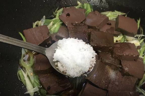 9.放入鸭血不要翻炒,会把鸭血碎,锅中直接加入三克盐、一汤匙生抽、半汤匙老干妈和十克糖,快速翻炒均匀。
