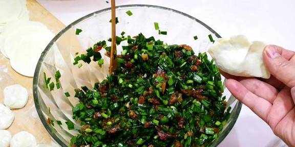 说了素三鲜,我们再表一表肉三鲜,肉三鲜的标配是韭菜,猪肉和虾仁,这里所说的虾仁是鲜虾去皮去壳后,我们取其肉拌到馅料里,其实只要想一想,嫩嫩的猪肉,翠绿的韭菜,配上鲜香的大虾仁,那口感,那味道,是不是叫你垂涎欲滴啊!在我们烟台地区,常常把虾仁用虾米代替,那又是别有一番滋味。下面我们看一下具体做法。