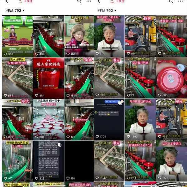 为了跟随年轻人的步伐,老干妈开始入驻抖音。在2020年2月,发布了第一条抖音。但是新品牌研究所发现,其抖音视频内容缺乏创意,不论是内容设计还是剪辑上,都比较粗糙。截止3月23日,其抖音拥有75.1万粉丝,792条作品,共获赞119.1万,单条视频点赞量普遍在1000以下。