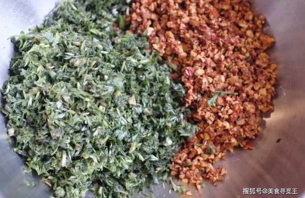 1、准备少许的新鲜茵陈,摘洗干净之后沥干水分;然后准备少许的大葱放在油锅中炸至葱花焦黄,稍微晾凉后倒入到茵陈里面,搅拌均匀;然后准备少许的玉米面和面粉混合均匀,一边往茵陈里面倒,一边搅拌。