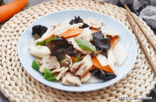 热锅凉油放入肉片滑炒,炒到变色盛出。接着倒入胡萝卜片翻炒一分钟,再倒入青椒、山药、木耳翻炒,炒到食材断生。