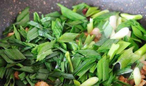 6、炒出青蒜的香味,蒜叶开始颜色变深的时候就可以出锅了。