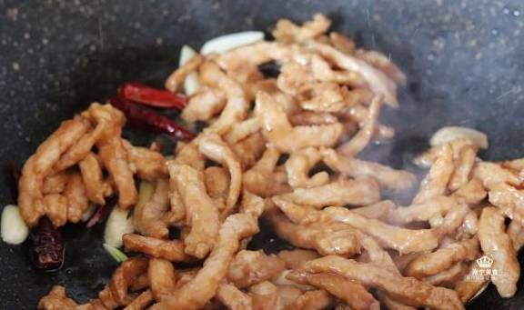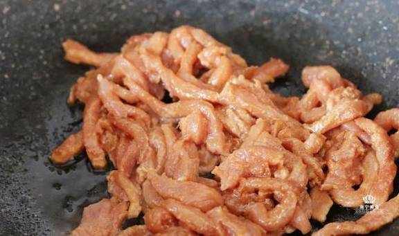 2、肉丝腌制好后,起锅大火烧热油,把肉丝倒入快速翻炒滑散,炒到肉丝变色8成熟之后盛出待用。(用大火快速滑散肉丝,可以让附在肉丝表面的淀粉快速的凝固,形成一层保护膜,可以避免热量直接和肉质接触,从而避免肉质的水分流水,让肉质更鲜嫩可口)