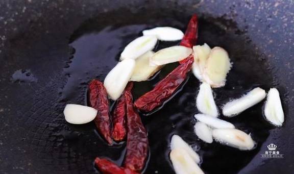 3、继续在锅里倒入适量的油,小火烧热油,把姜片、大蒜、干辣椒一起倒入爆香。