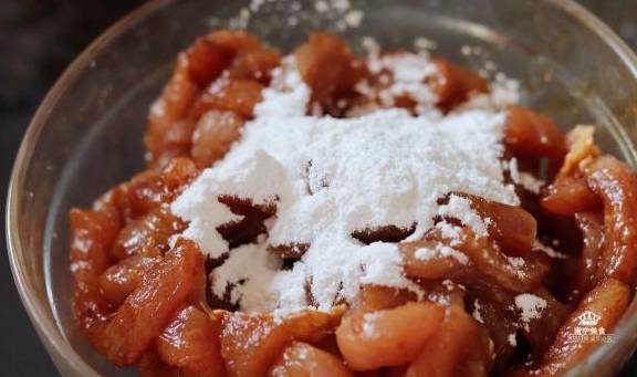1、把猪肉洗净后顺着纹理切成肉丝,放入碗里,再放入一勺蚝油、半勺老抽、半勺食盐、少量水、一起搅拌均匀,再放入一勺淀粉、少许食用油一起搅拌均匀,腌制10分钟。(放入了调味料腌制,可以让肉质更入味,放入淀粉腌制,可以让肉质吃起来更鲜嫩,顺着肉纹理切,吃起来就不会太难嚼)