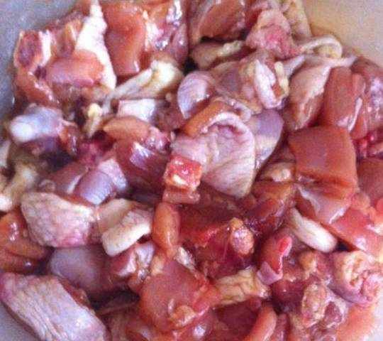 第一步,先处理鸡,鸡腿肉切块儿,加盐,料酒,酱油腌制十分钟!