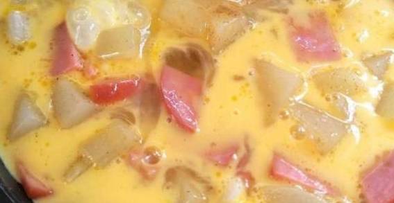 加一些盐和胡椒粉调味,将锅内食材分布均匀,再将拌好的蛋液倒进去,这时候的画面已经很好看了呢,是不是有点小期待了呢?