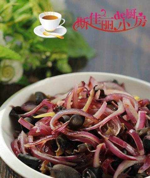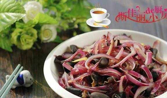 制作:1.准备好原材料;2.烧锅水,加入点盐,将木耳放入里面焯煮熟;3.热锅凉油,放入洋葱进去翻炒;4.洋葱香味出来后加入黑木耳进去翻炒;5.翻炒两下后加入盐调味;6.翻炒均匀即可盛入盘中。