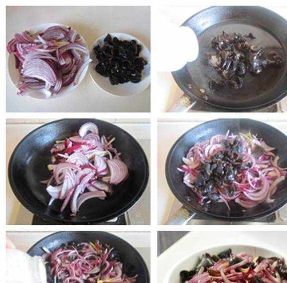小贴士:1.黑木耳要提前焯水预处理熟,焯时加入点盐入底味;2.先爆炒洋葱,将洋葱的香味炒出来。