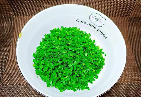 ①我们把韭菜洗干净,切成碎末放入碗中。加入1勺油,拌一拌,防止出水。