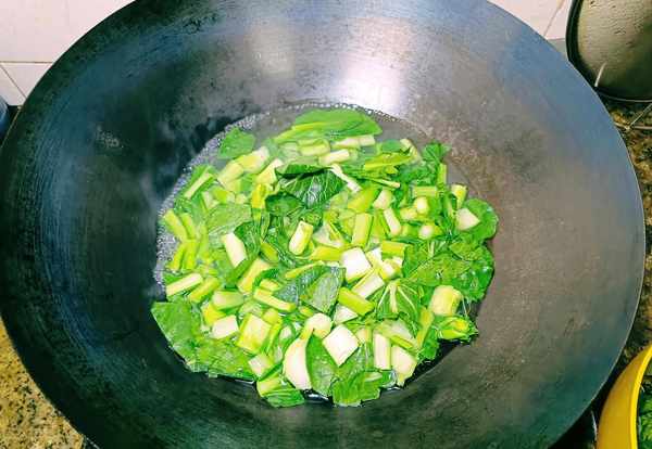 ②锅中烧水,加一点盐和食用油保持菜色不变。水开后倒入菜苔焯水,约30秒捞出来过冷水。