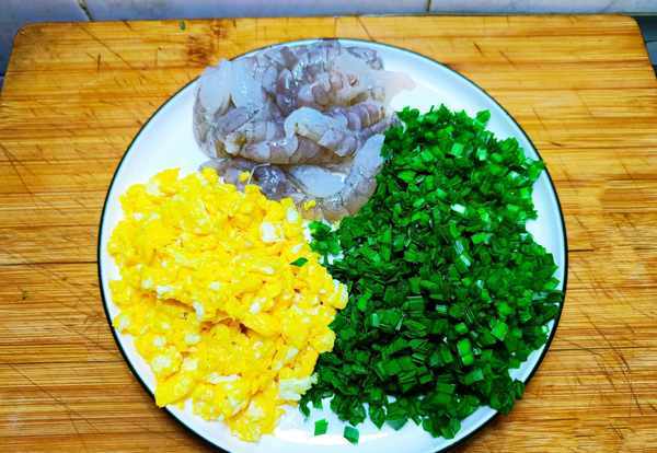 食材:饺子皮400克、韭菜150克、鸡蛋4个、虾仁适量、葱、姜、盐、食用油